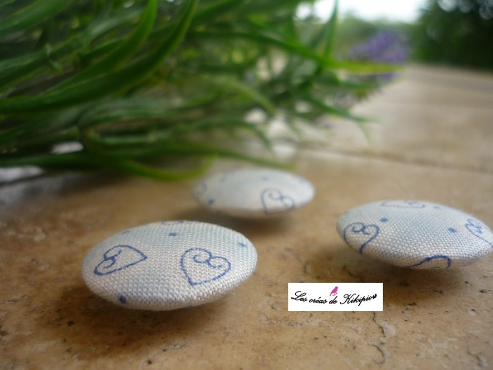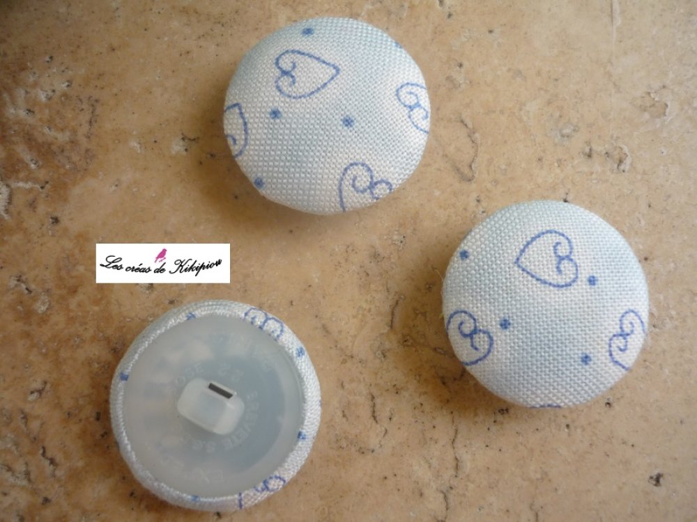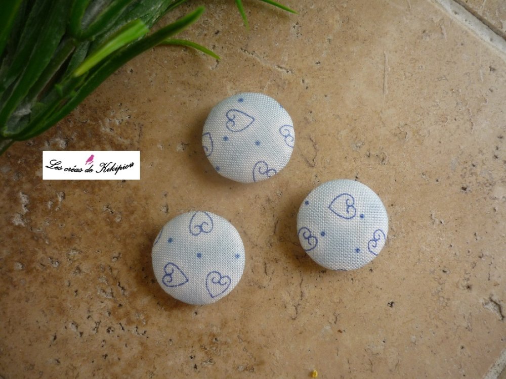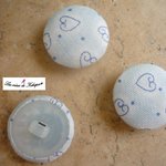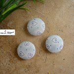 Lot de 3 boutons recouverts de tissu fantaisie à motifs cœurs.