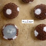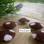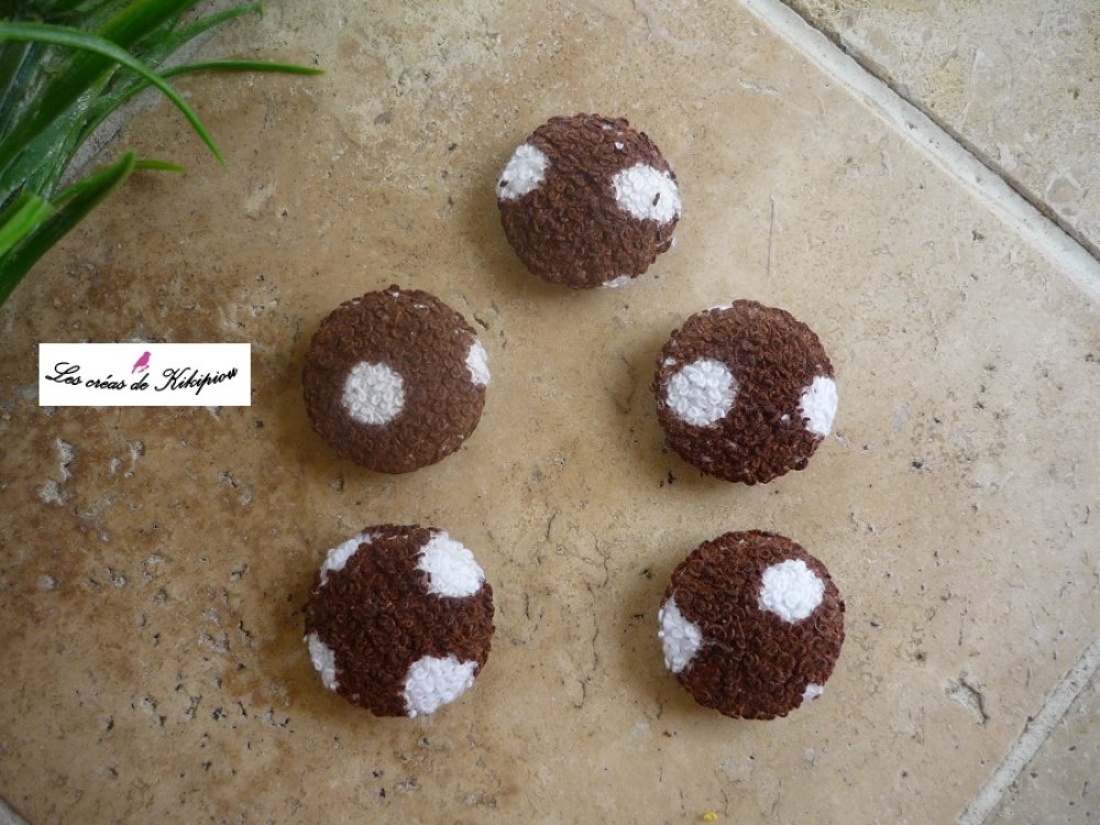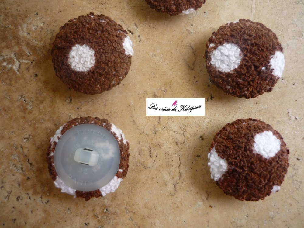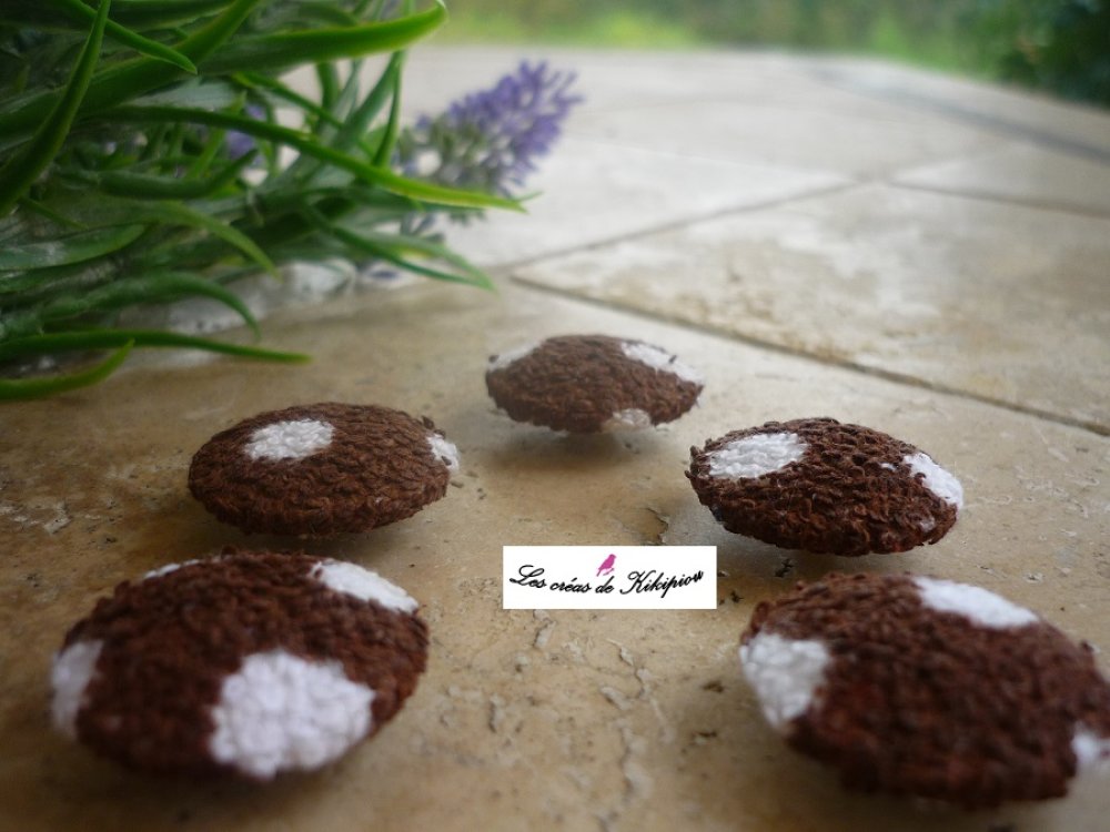 Lot de 5 boutons recouverts de tissu éponge marron à pois blancs.