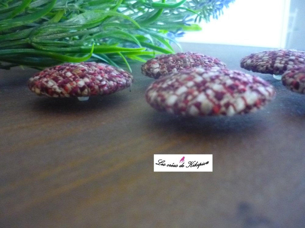 Lot de 5 boutons recouverts de tissu tweed chiné bordeaux.