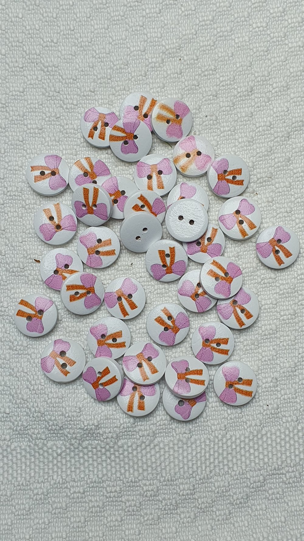 6 boutons petit noeud fuchsia à pois de 15x3mm en bois à 2 trous .