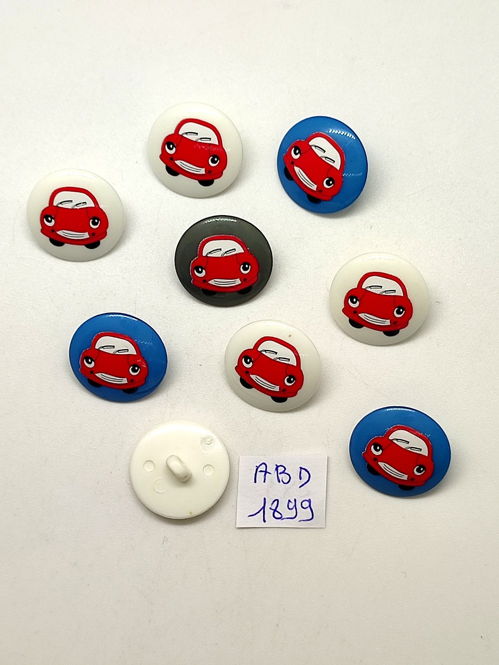 9 Boutons fantaisie en résine - une voiture blanc rouge et bleu - 18mm - ABD1899