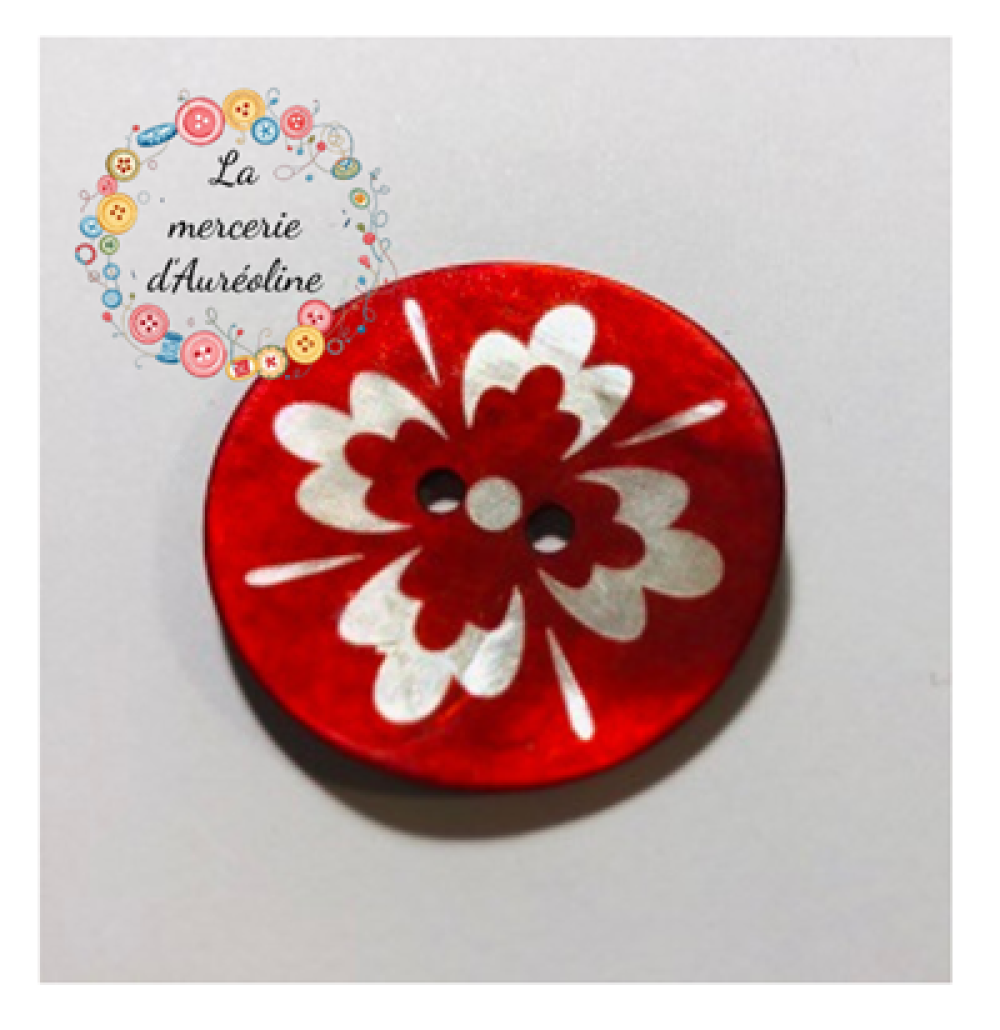Joli bouton rond en nacre de couleur rouge avec une fleur blanche gravée ; Bouton à coudre à 2 trous d'un diamètre de 34mm