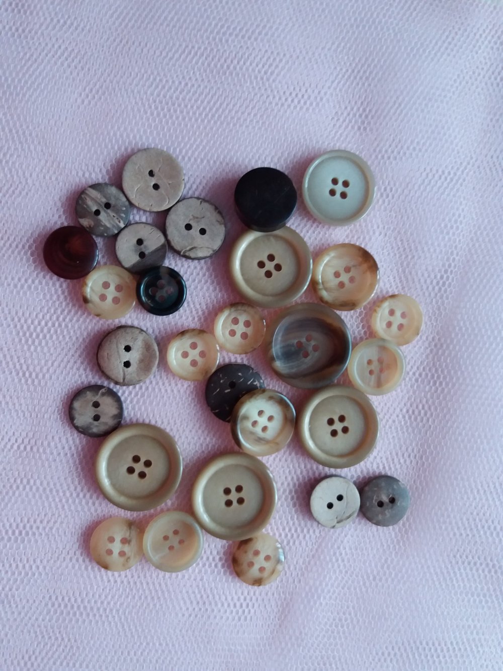 Je vous propose cet ensemble de boutons en plastique, couleur marron clair/beige, tailles variées allant de 2,5 cm pour les plus grands à 1,5 cm pour les plus petits.
