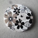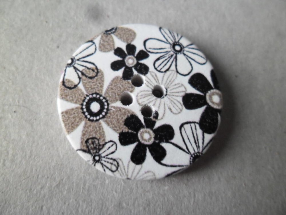 ce très beau lot de 5 boutons en bois fond de couleur blanc à motif fleur marron,beige,noir à 4 trous.