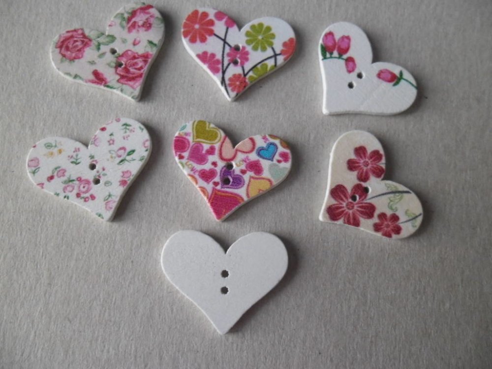 ce très beau lot de 5 mixte boutons en bois en forme de coeur multicolore sur fond blanc à 2 trous.