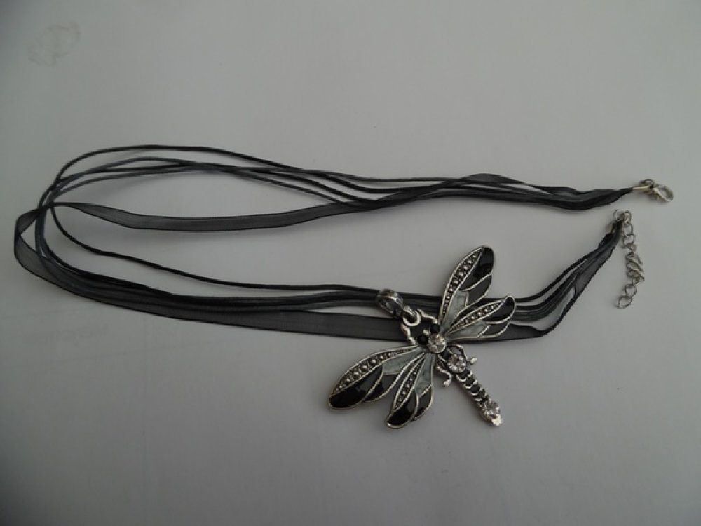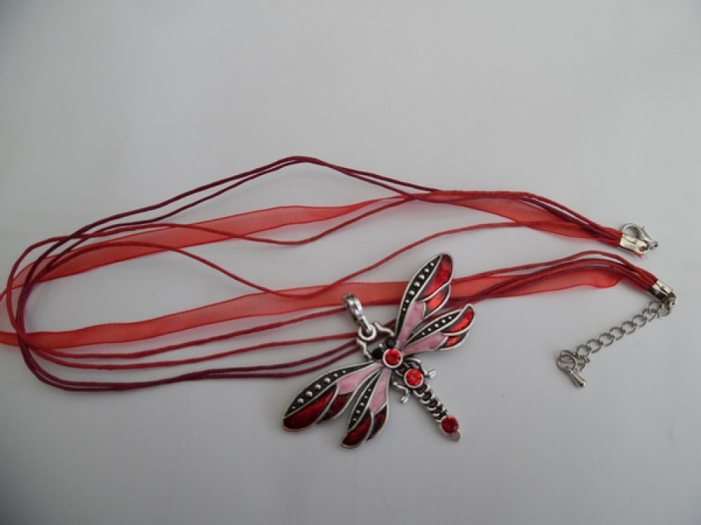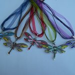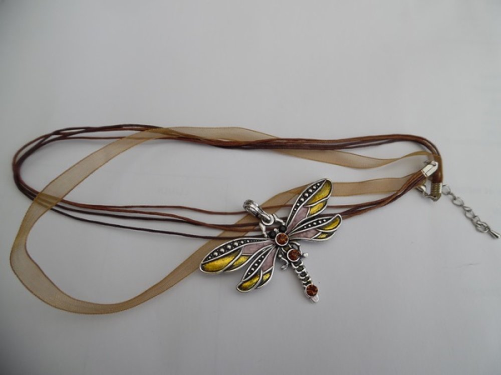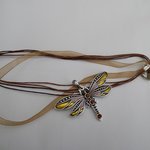 1 collier libellule émaillé Ton jaune rose 4.1x4cm strass argent Tibétain + Collier Lien Ciré et Organza de 42cm