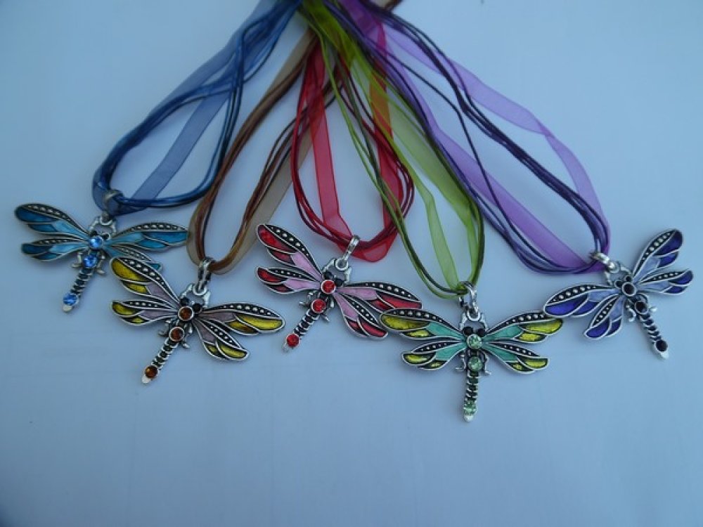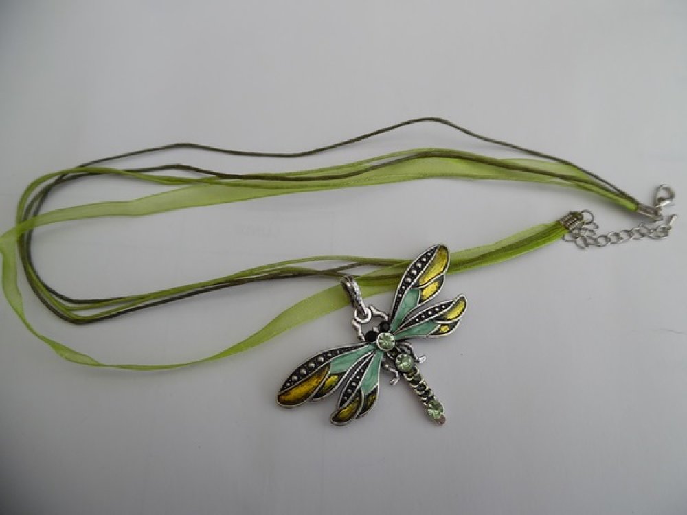 1 collier libellule émaillé Ton vert 4.1x4cm strass argent Tibétain + Collier Lien Ciré et Organza de 42cm