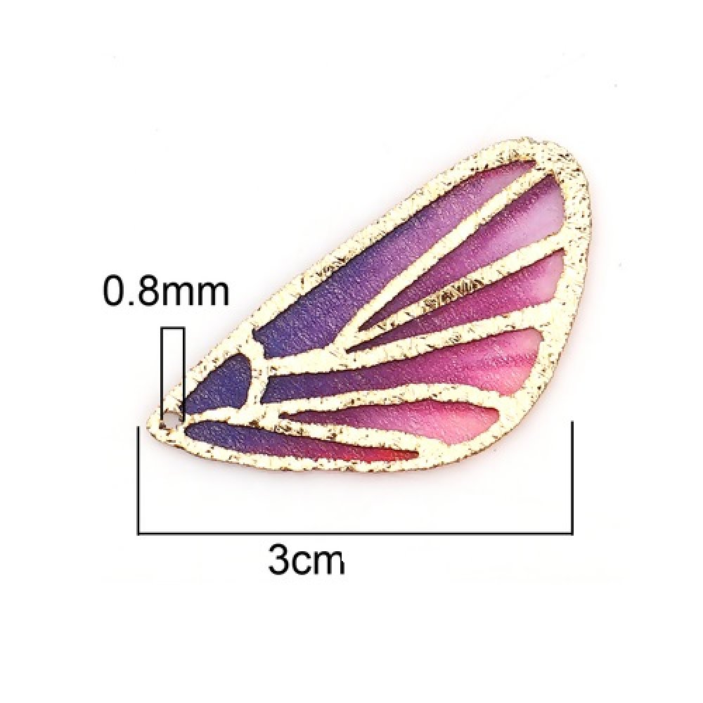 Ce pendentif représente une aile de papillon très colorée de violet, rose fuchsia ourlé de doré.