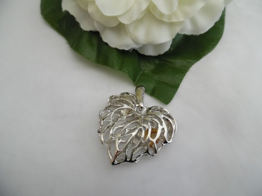 1 Pendentif coeur feuille filigrane ajouré Bombé avec Perles Strass à l'intérieur Argenté Brillant 3.6x3.9x1.2cm