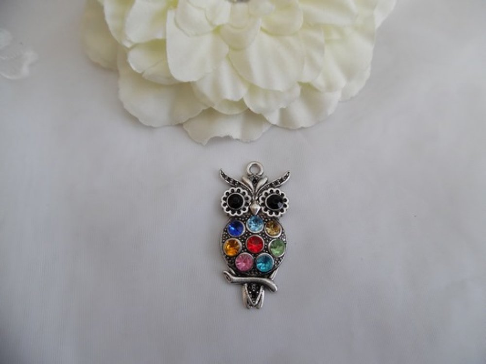 1 Pendentif H1 hibou chouette 4.75x2.4x0.5cm strass multicolore ciselé argent tibétain