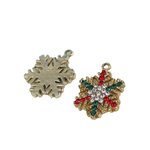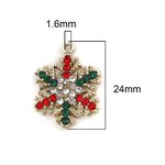 Un joli pendentif de Noël en forme de flocon de neige en métal doré rehaussé de strass rouge, vert, transparent. Le verso est tout doré lisse.