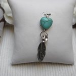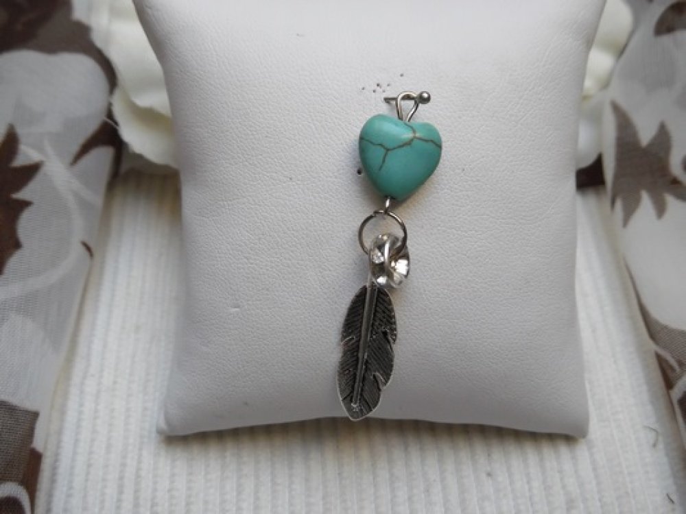 1 Pendentif Support de Boucles d'Oreilles coeur et plume Turquoise Strass 5.1x1.2cm Argent Tibétain