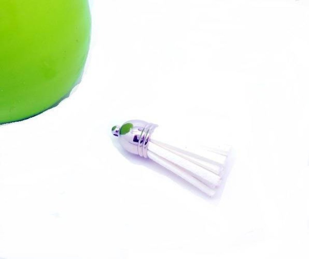 1 Breloque Pendentif Pompon en Suedine imitation cuir couleur Blanc et calotte forme chapeau en CBB acrylique argenté.