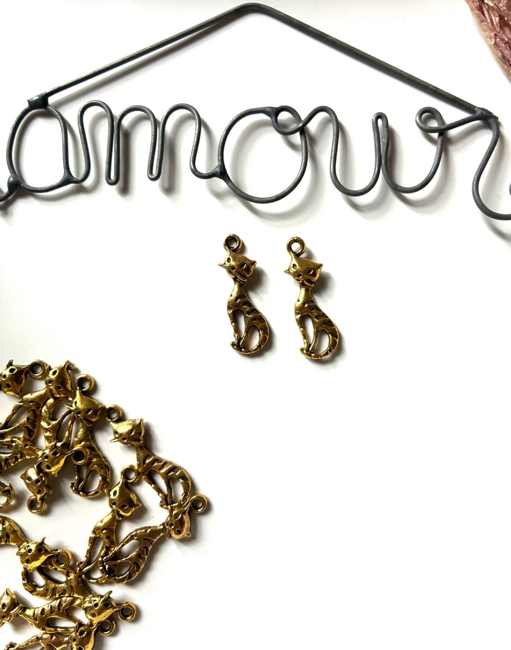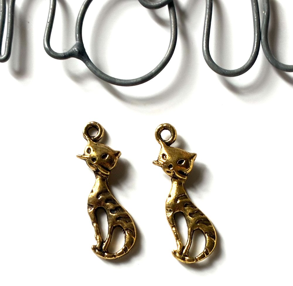 Ce lot est composé de deux breloques chat en métal doré vieilli à piquot, dimension = hauteur 3cm