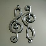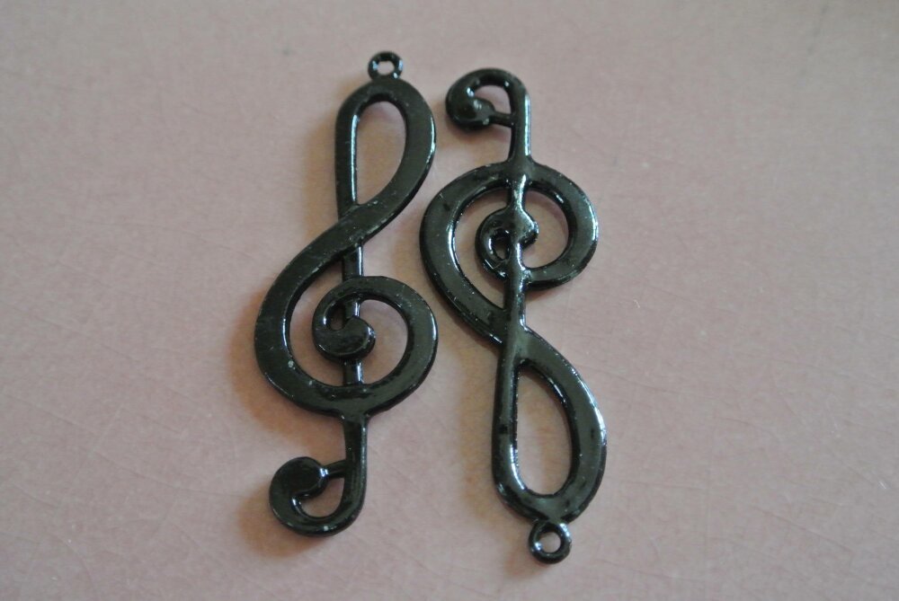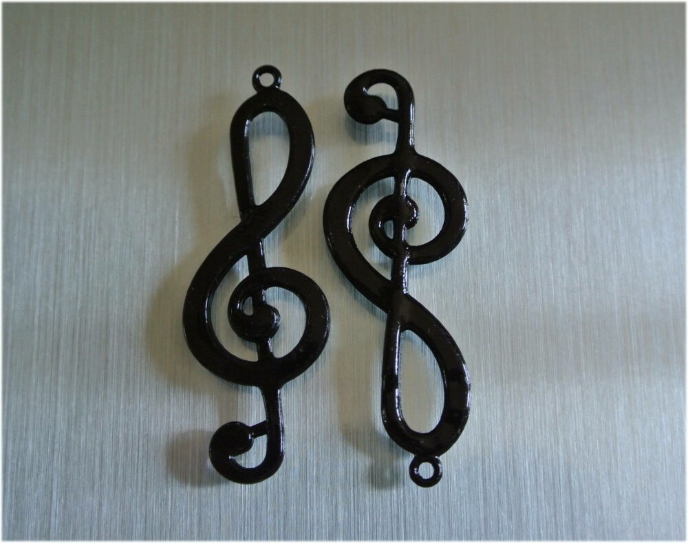 Lot de deux grandes breloques en métal laqué noir en forme de clef de sol de dimensions 62 x 21 x 3 mm