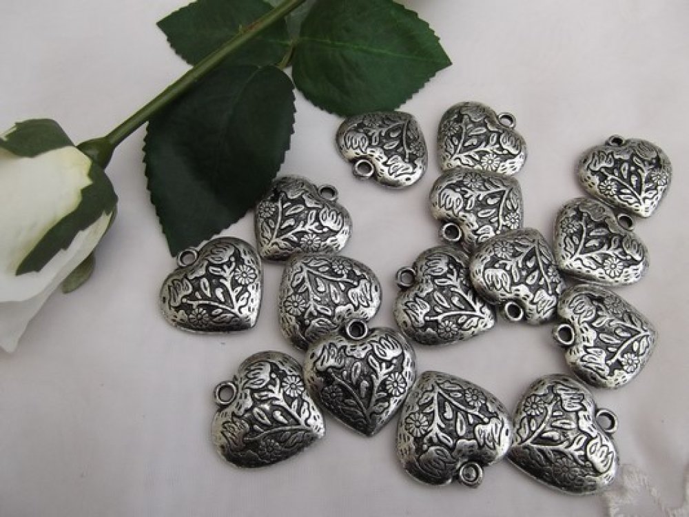2 gros coeur 30x30x6.5mm gravés fleur 3D acrylique argenté noir