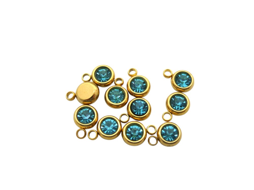 Lot de 5 petites breloques, pampilles en acier inoxydable doré et strass en verre bleu turquoise.