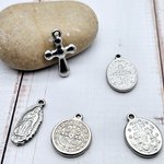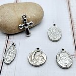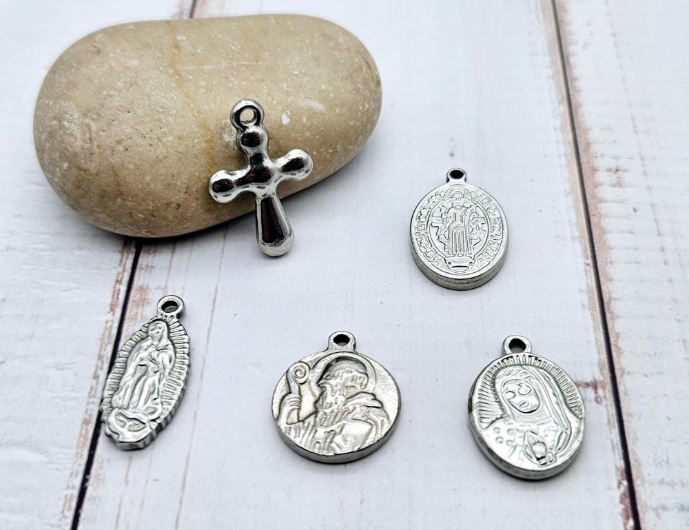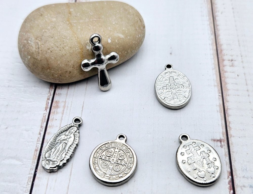 Apportez une dimension spirituelle 💕mbolique à vos créations avec ce lot de 5 breloques religieuses chrétiennes en acier inoxydable 201 💫. Chaque breloque représente un symbole fort de la foi chrétienne : Vierge Marie, croix, médailles ovales et rondes ornées de détails sacrés 🙏.
