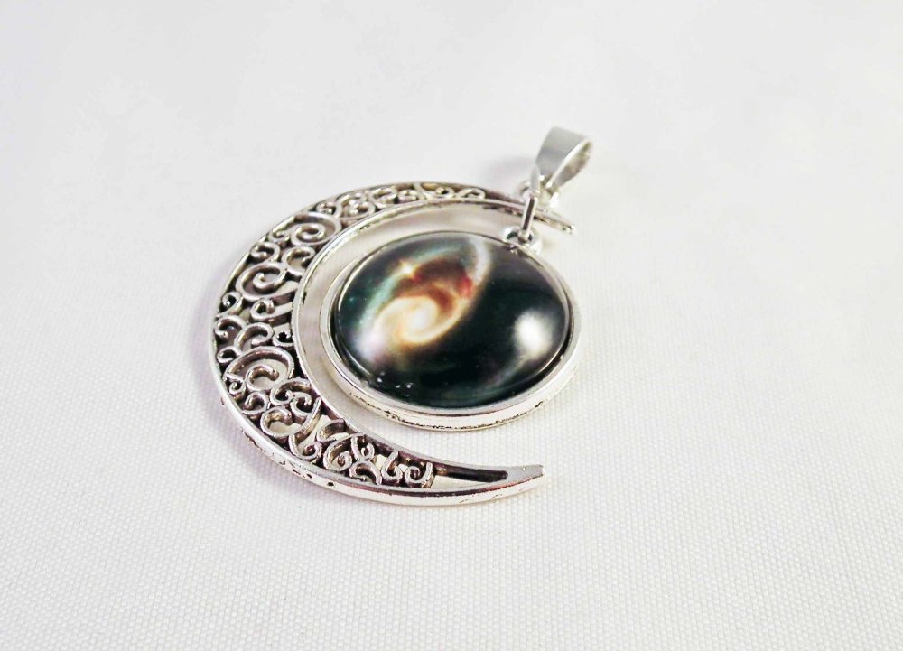 Breloque Pendentif Cabochon Motif Lune Argent Vieilli et Galaxies avec Bélière, 38mm de diamètre approximativement.