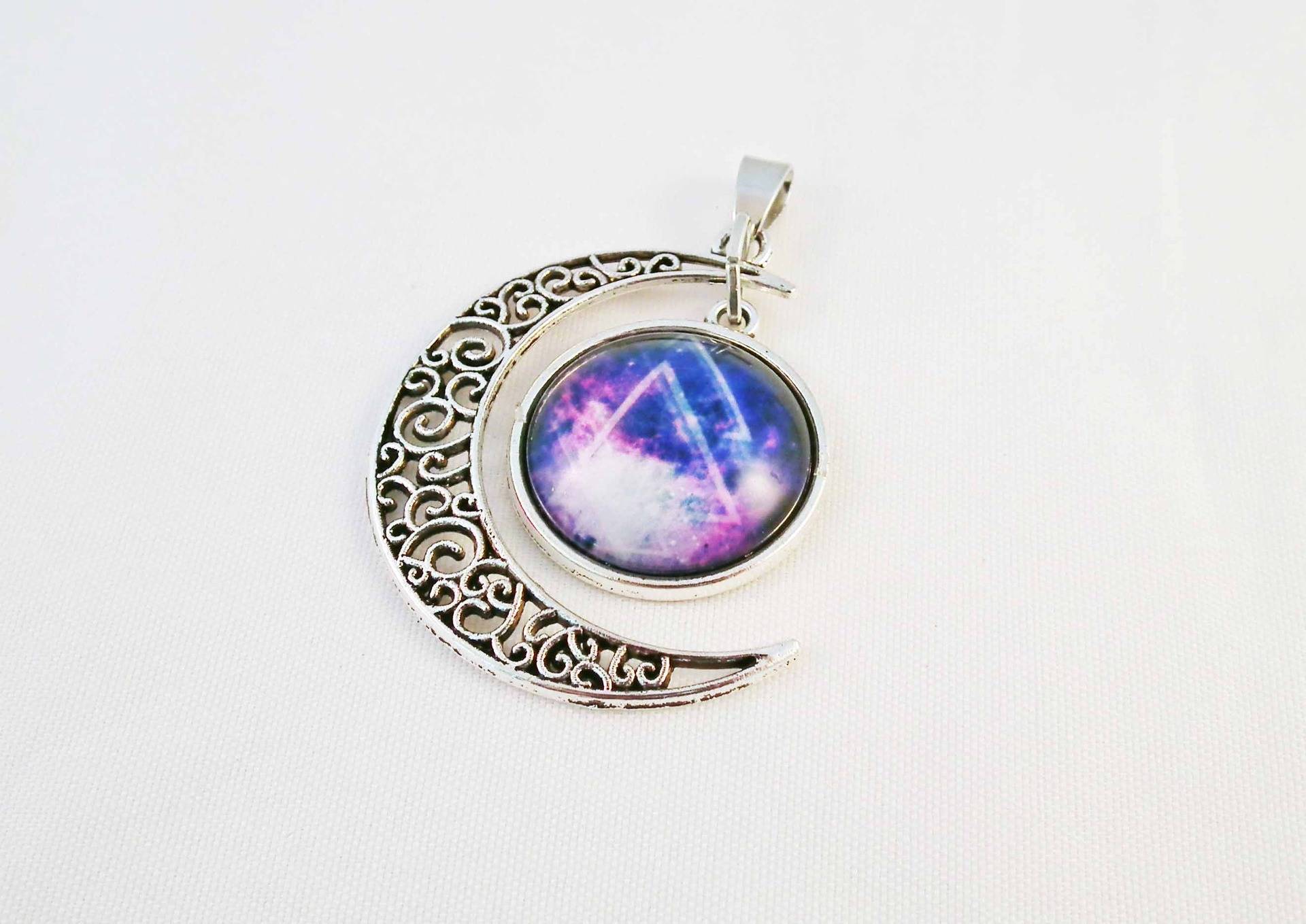 Breloque Pendentif Cabochon Motif Triangle Argent Vieilli et Galaxies Étoiles avec Bélière, 38mm de diamètre approximativement.