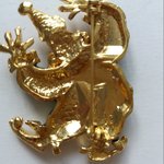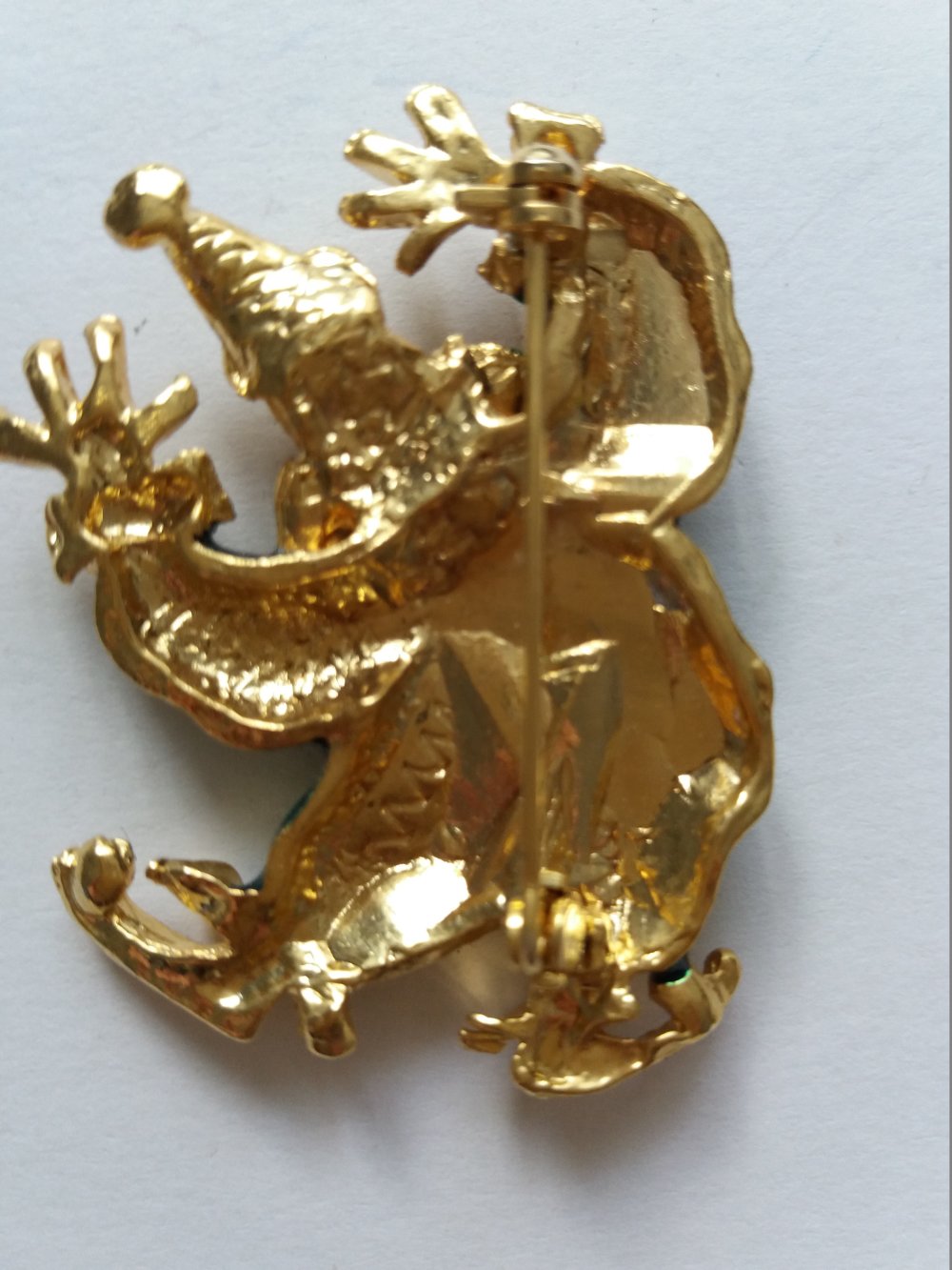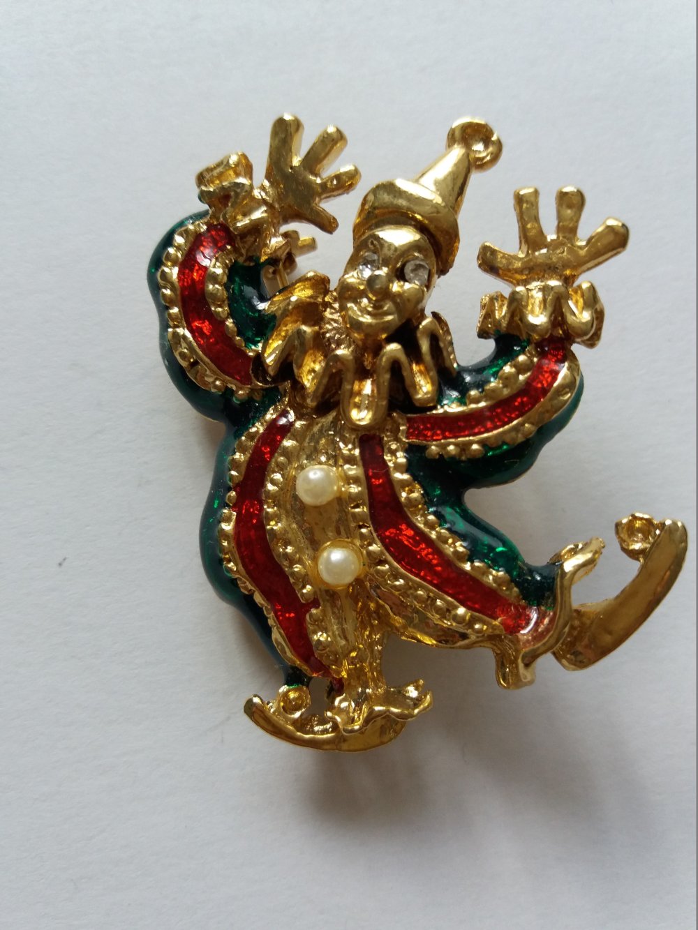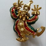 Broche "Clown" en métal doré, vêtement rouge et vert