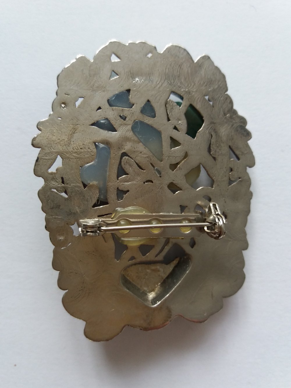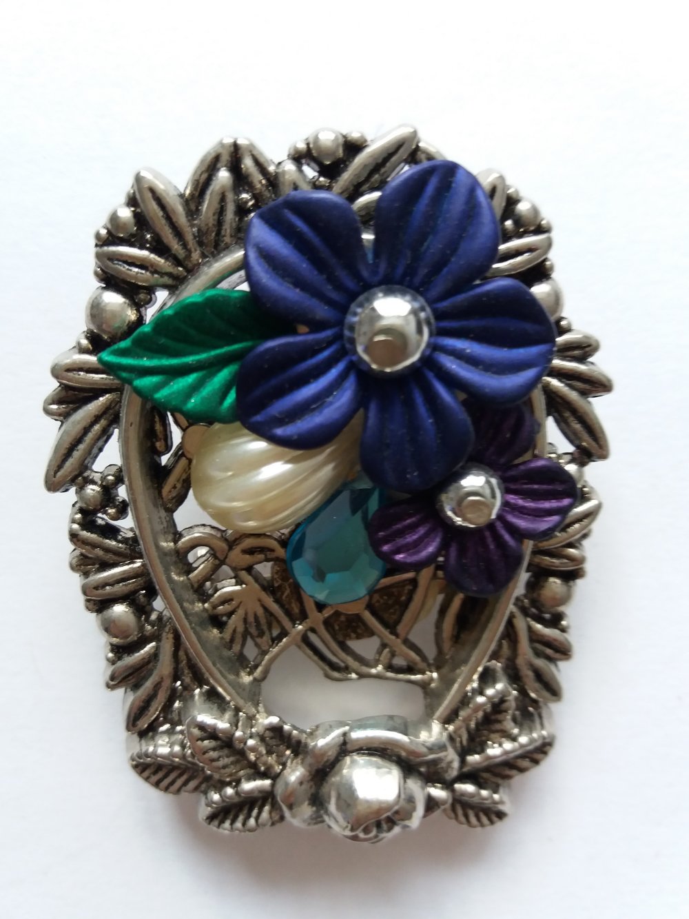 Voici une broche fantaisie dans le style "Art Nouveau", effet métal argenté décoré avec fleurs violettes en plastique, perle synthétique nacrée, strass bleu.