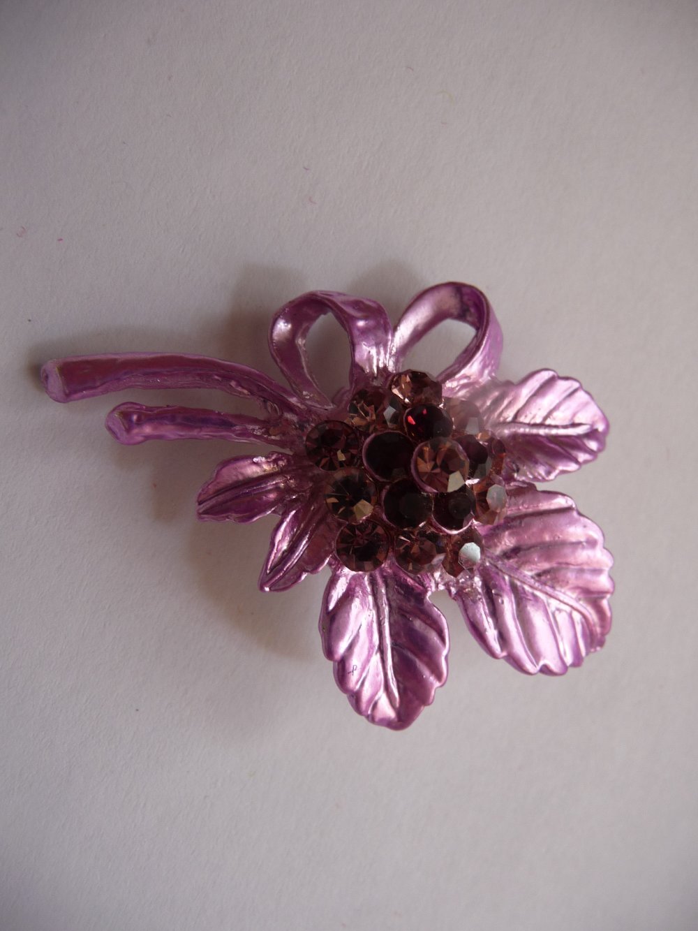 Je vous propose cette broche en métal, forme bouquet de fleurs, couleur rose violine irisé, avec un centre en petites perles roses et grenat .