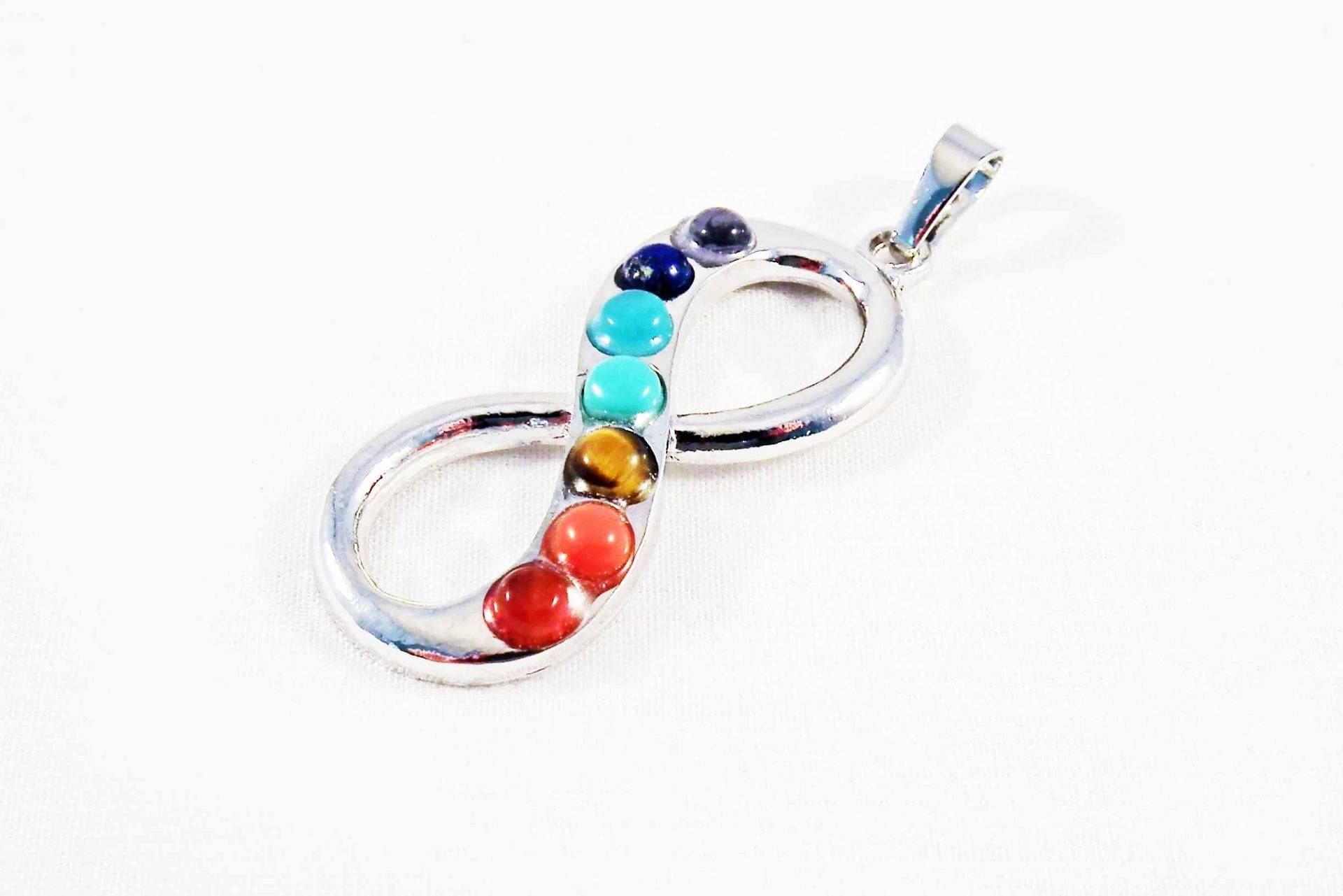 Breloque Pendentif Plaqué Or Blanc 18K et 7 Chakras en Pierres de couleurs Centres d'Énergie Corps Astral Symbole Infini Inifinité