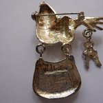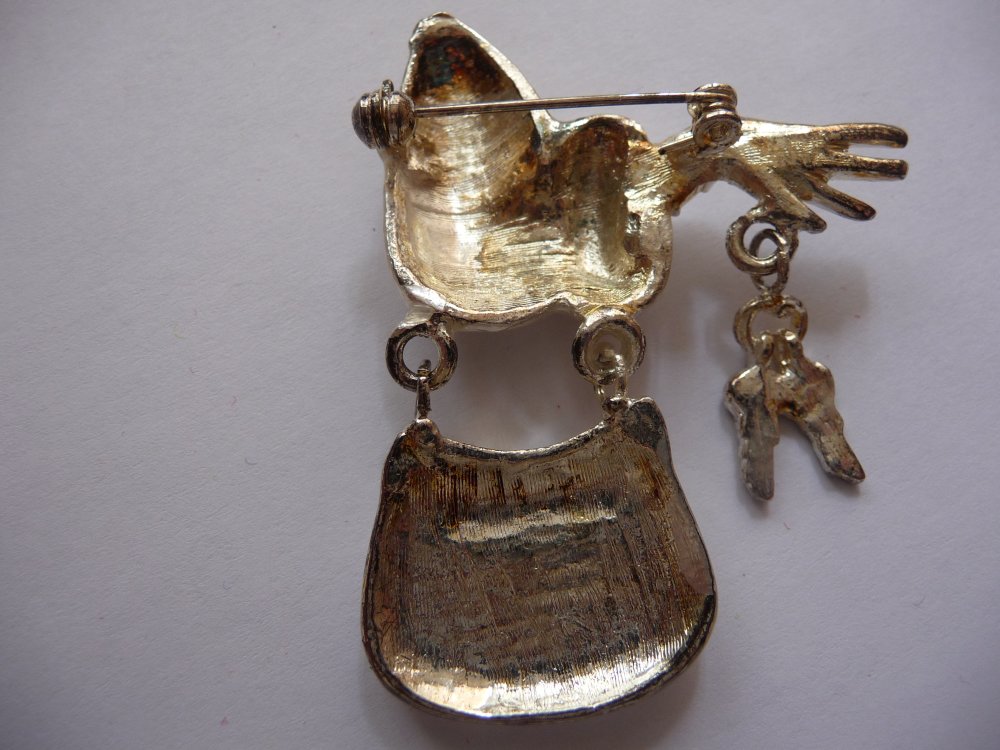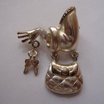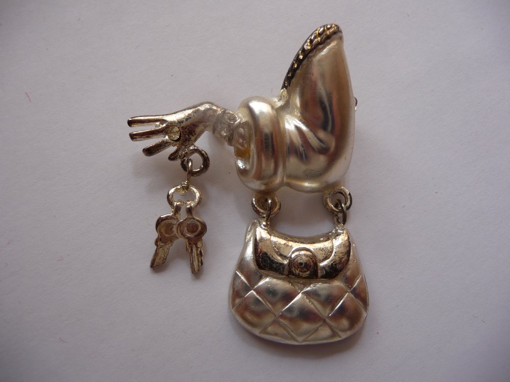 Voici une broche fantaisie représentant un bras avec sac à main, main et clés, en métal argenté - dimensions : 6 cm de hauteur, 4 cm de largeur. Le sac et les clés sont mobiles. Deux strass au poignet.