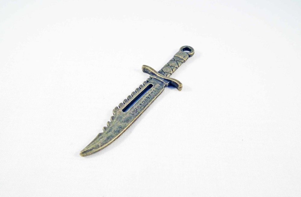 Pendentif Breloque Couteau survie forêt arme Bronze Vieilli, 58mm X 16mm, Épaisseur 3mm.