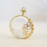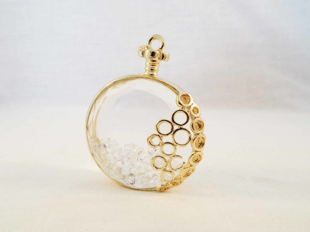 Grande Breloque Pendentif Doré en verre transparent Flacon Parfum Perles Cristal Flottant Légères imperfections sur les bords du verre, 4cm de diamètre.