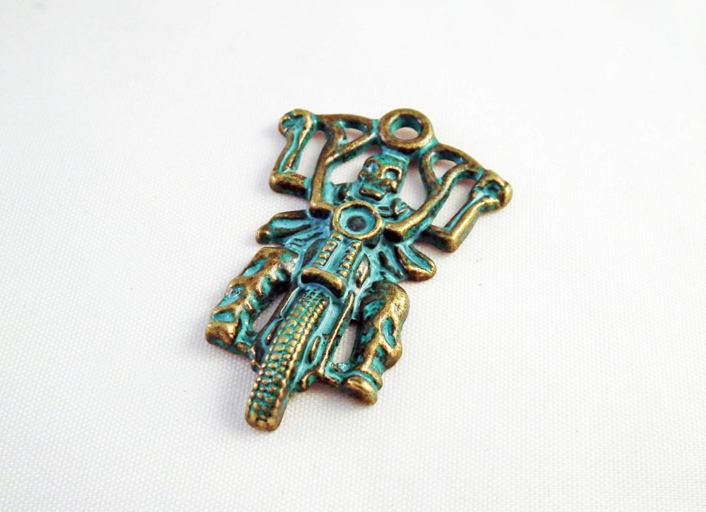 Grande Breloque Pendentif Tête de Mort Squelette Moto Bronze Vieilli Reflets Bleu