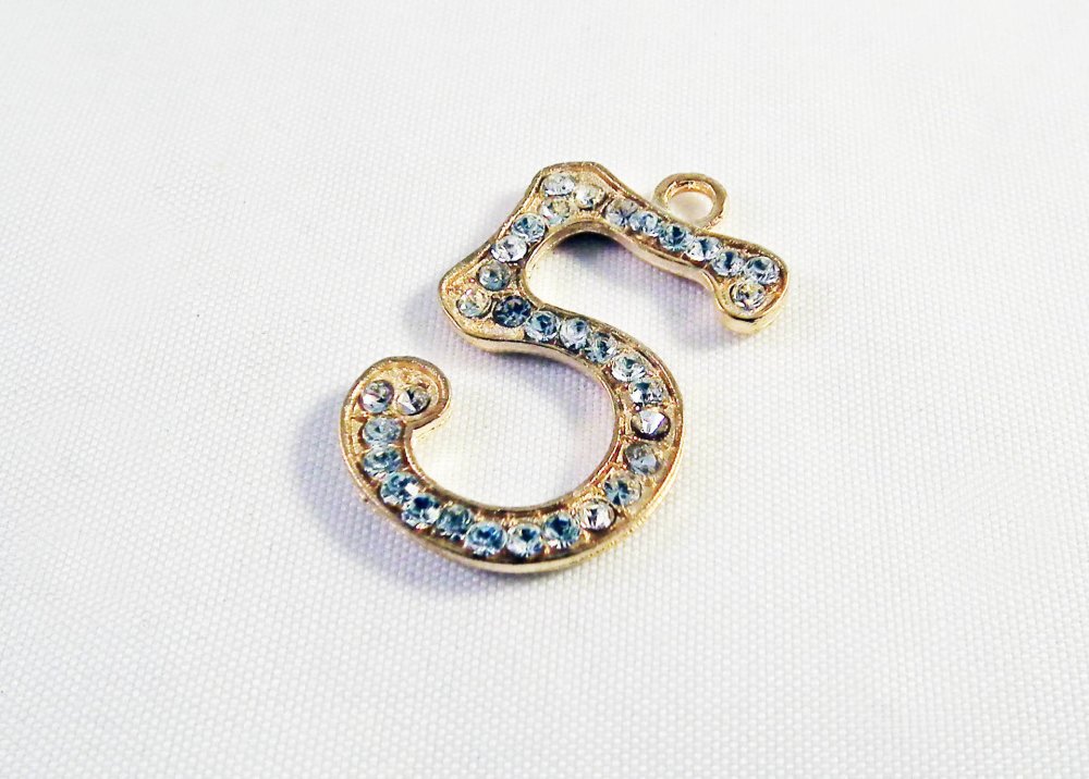 Breloque Pendentif Numéro 5 Doré avec Strass Mode Luxe, 30mm X 18mm, Taille de trou 2mm.