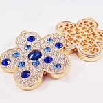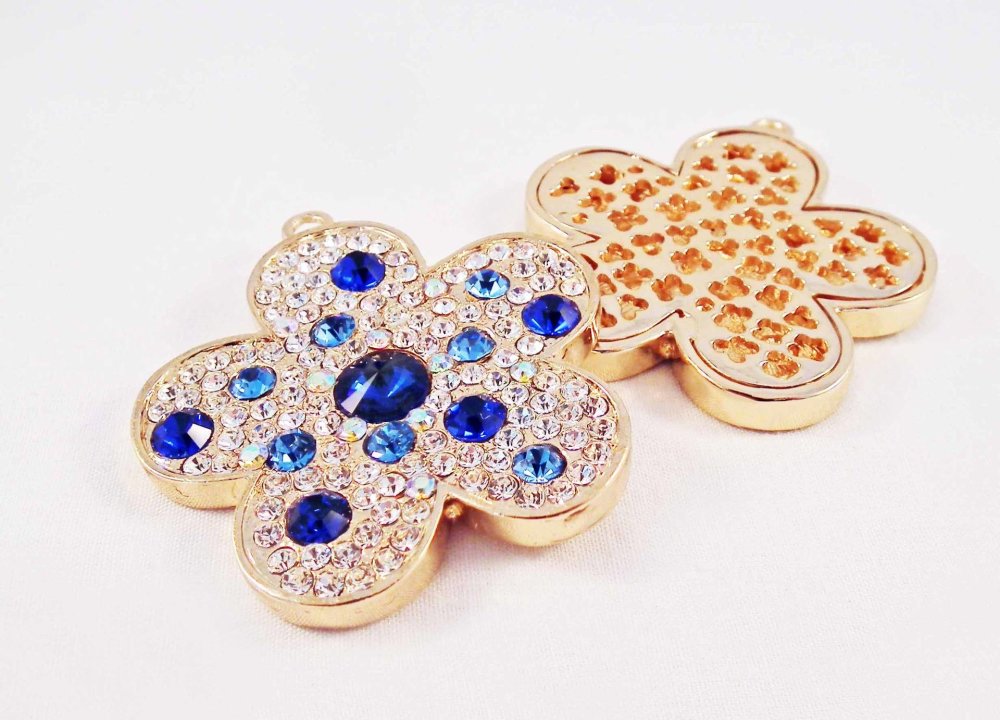 Grand Pendentif Breloque Réversible Fleur Monture Doré Champagne et Cristal Strass Bleu, 44mm X 44mm, Épaisseur 5mm.