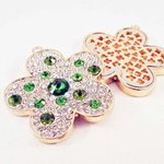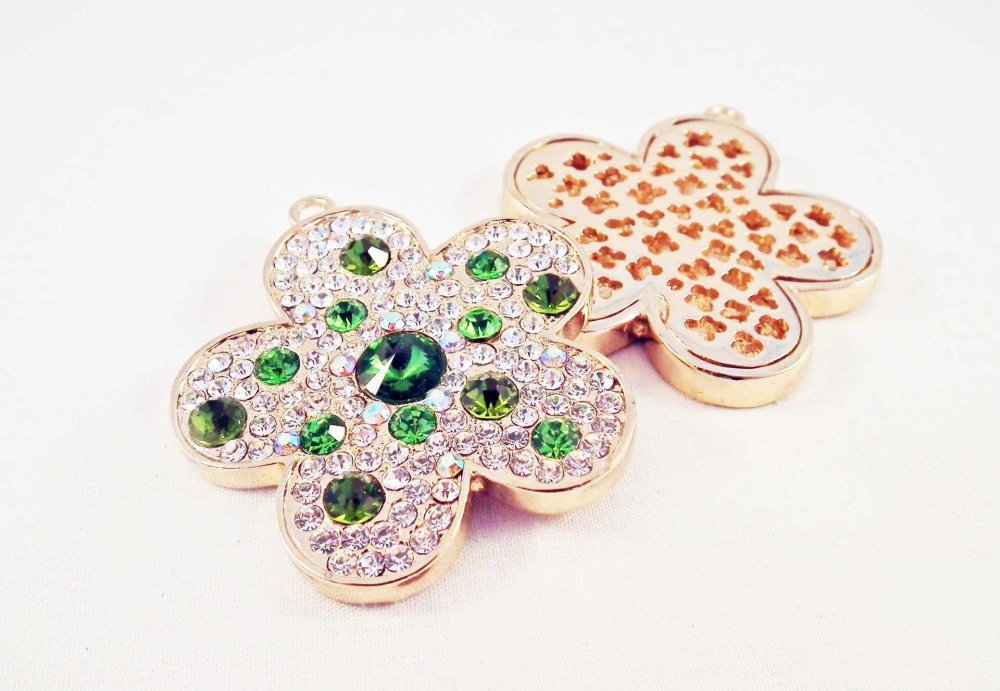 Grand Pendentif Breloque Réversible Fleur Monture Doré Champagne et Cristal Strass Vert, 44mm X 44mm, Épaisseur 5mm.