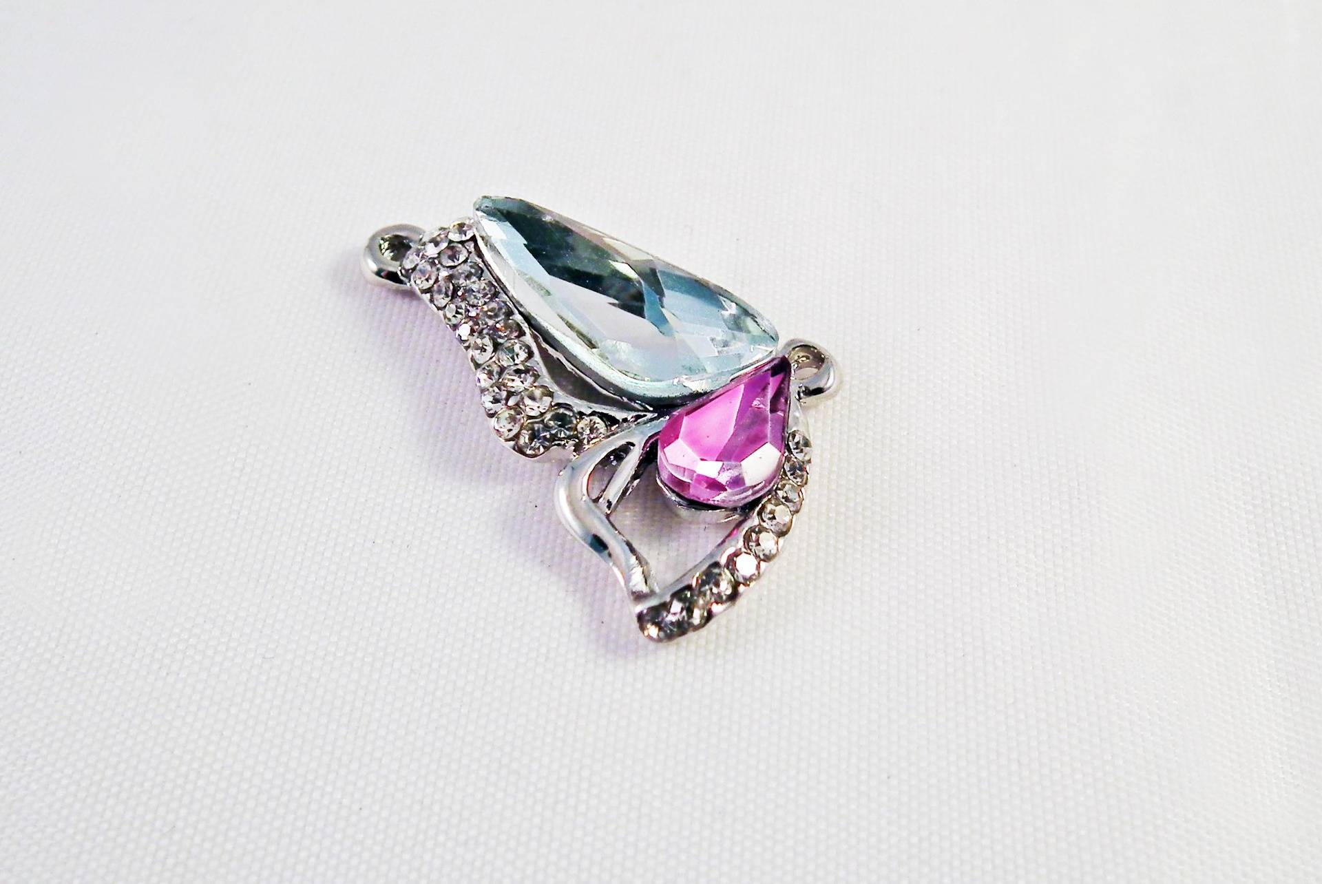 Joli Pendentif Connecteur Cristal Bleu et Lilas et Strass en forme de Papillon Style Swarovski, 30mm X 16mm.