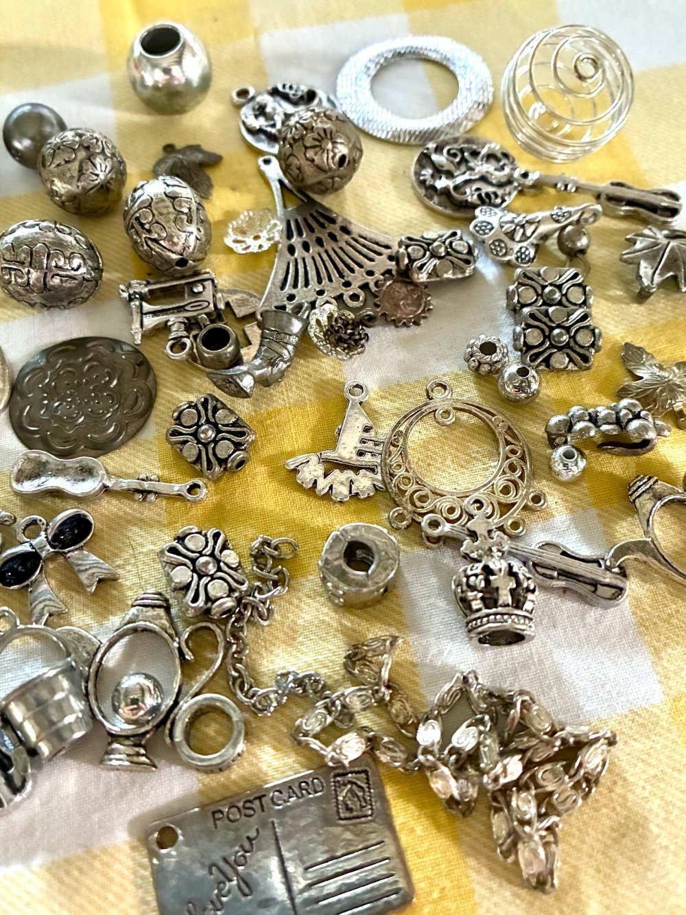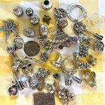 Ce Lot est composé de perles, breloques et apprêts : guitare, perles, coupelles, coeur, fleur, cheval, médaillon, etc