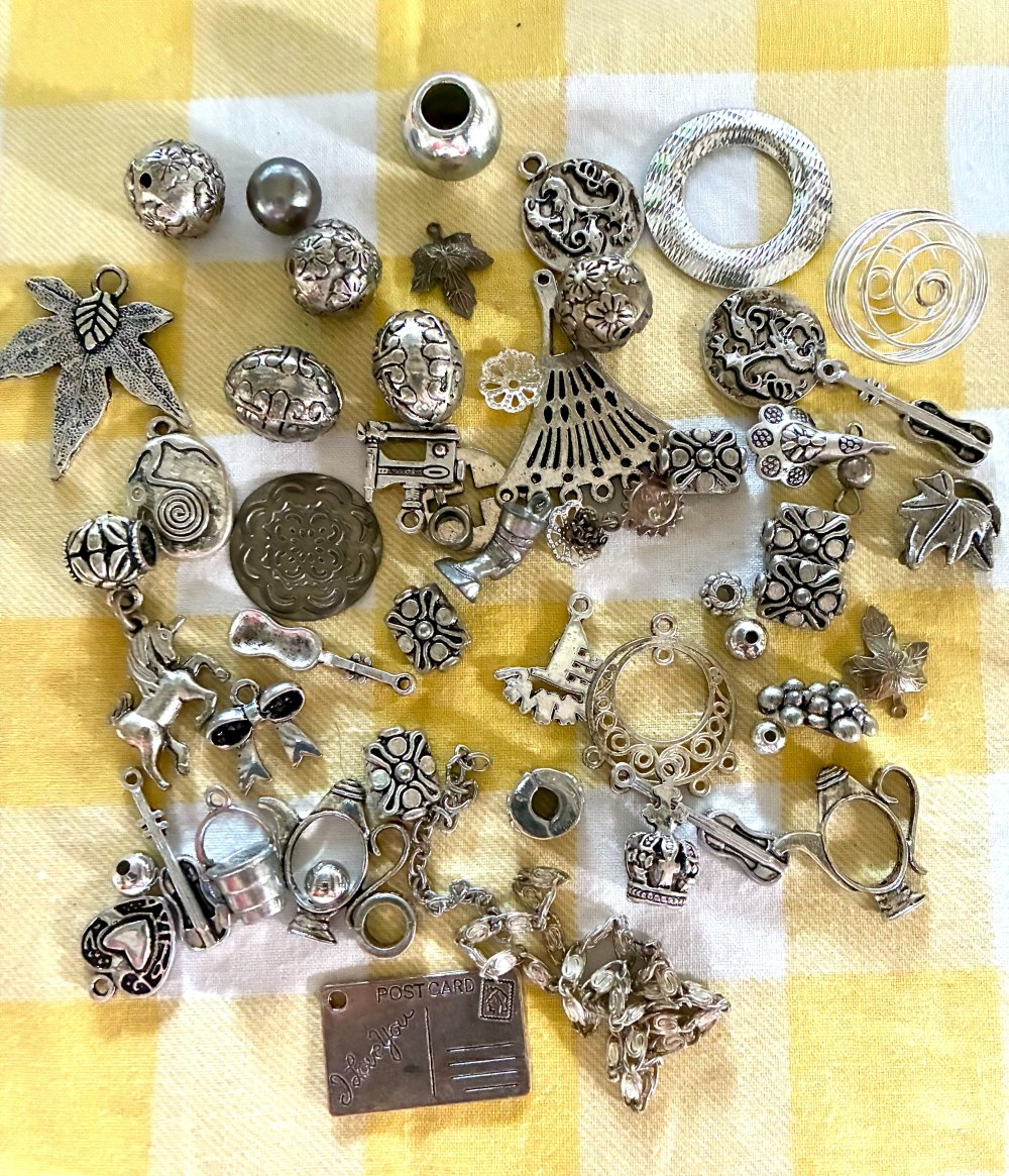 Lot assortiment 55 perles et apprêts en métal argenté formes variées