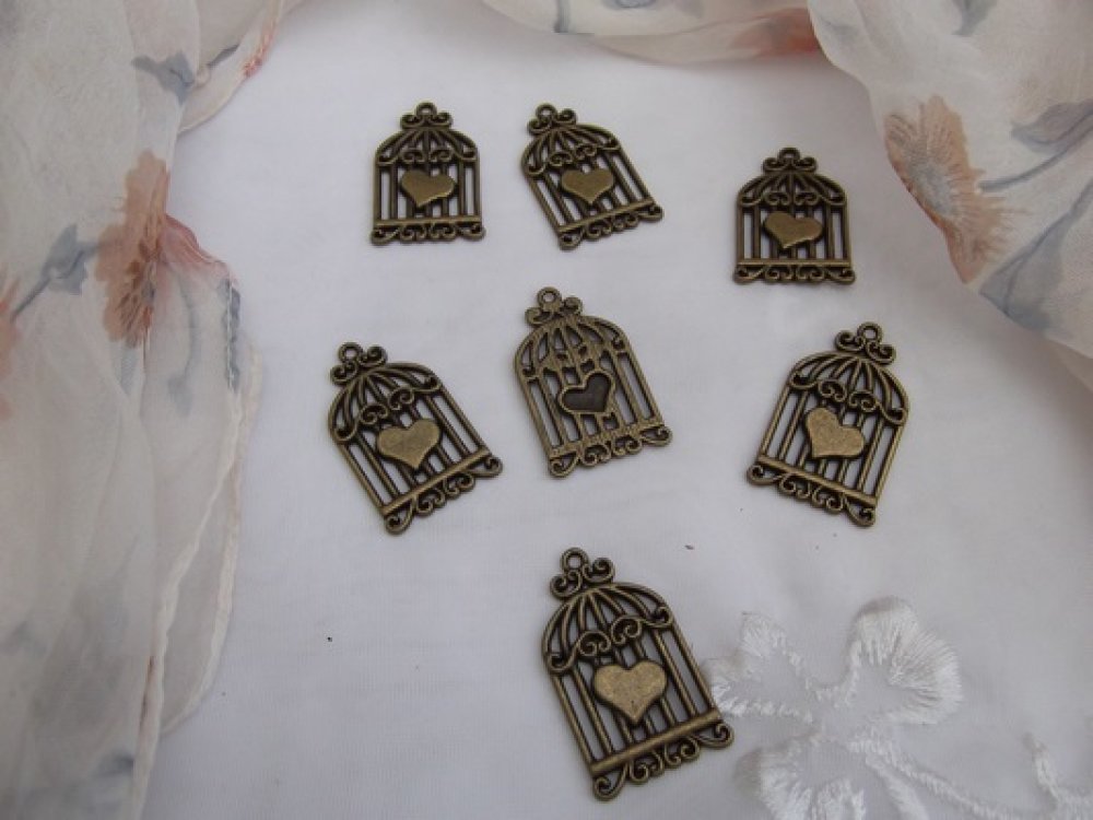 Lot de 2 Breloques Cage à oiseau avec Coeur 3D Ajouré Bronze 33x20mm
