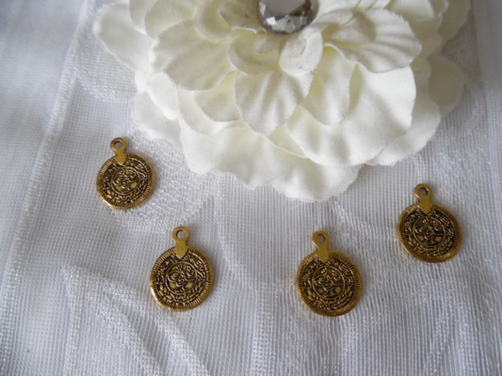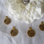 Lot de 2 pendentifs ou support de boucles d'oreilles 23x17mm rond motifs divers 3D doré vieilli
