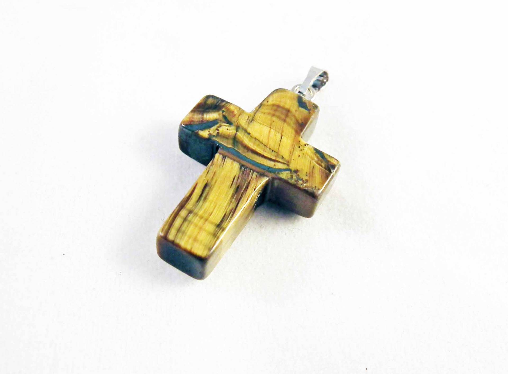 Magnifique Breloque Pendentif Croix en Pierre Oeil de Tigre avec Bélière, 29mm X 18mm X 5mm.