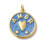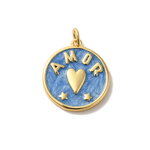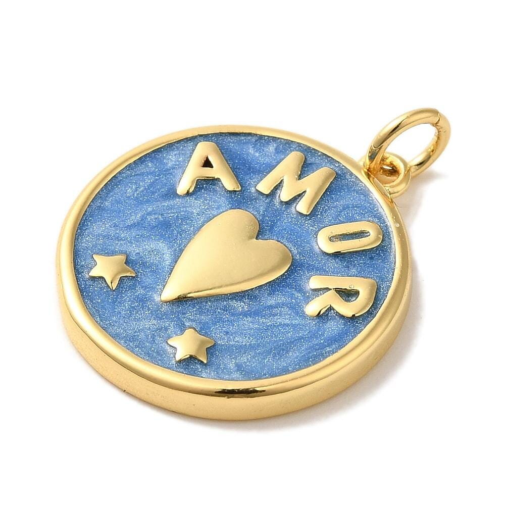 Le pendentif présente une base en émail bleu, agrémentée d'un cœur doré central et de deux étoiles dorées. Le mot « AMOR » est inscrit dans les lettres dorées .