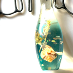 Ce pendentif mesure 55x18mm, en matière synthétique avec une bélière en métal argenté il est composé à l'intérieur d'un décor en turquoise (effet mer) avec algue et coquillages, d'autres pendentif avec coquillages en boutique