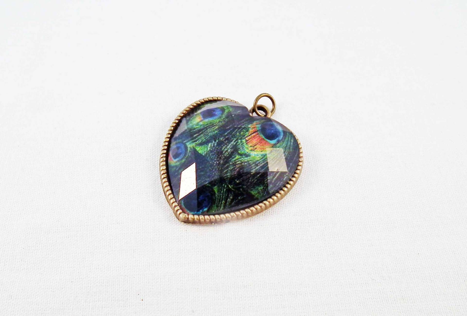 Pendentif Breloque Cabochon en Verre en forme de coeur Bronze motif Paon Plumes, 30mm X 28mm.