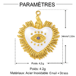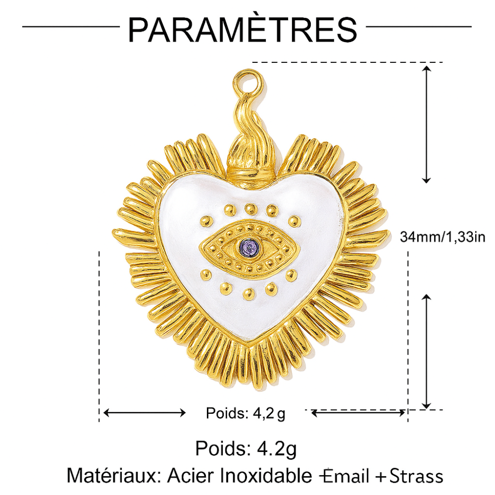 Pendentif en forme de cœur sacré, à la fois mystique et raffiné. Fabriqué en acier inoxydable 304 et recouvert d’un placage or véritable 18K par placage ionique (IP), ce pendentif est décoré d’un émaillage blanc brillant et orné d’un strass bleu central en forme d’œil protecteur.