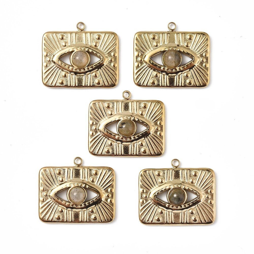 Pendentif médaille rectangle œil protecteur 17,5 mm en acier inoxydable doré avec une pierre labradorite