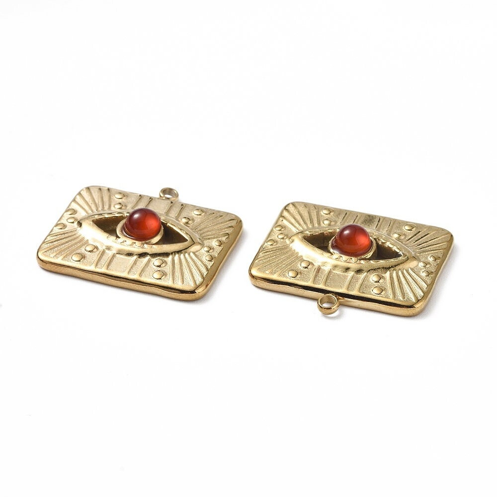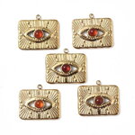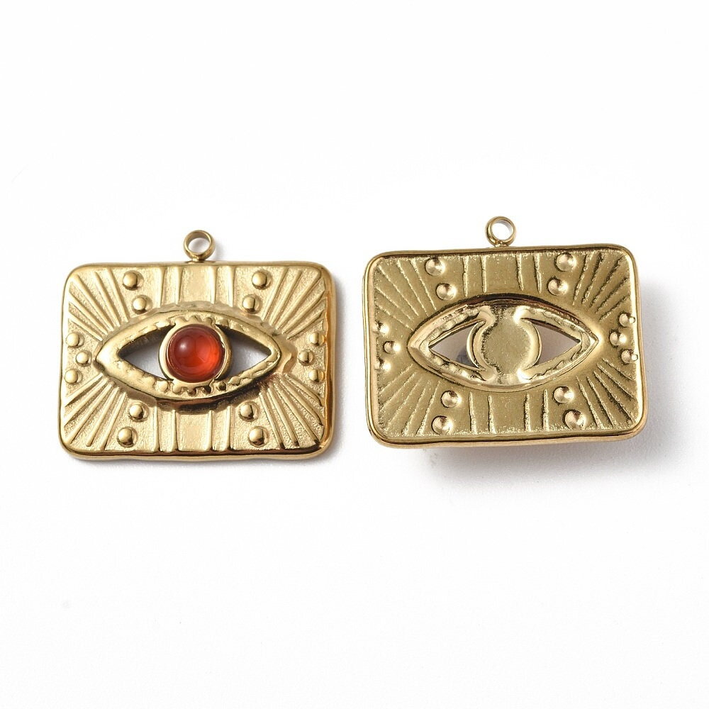 Pendentif médaille rectangle œil protecteur 17,5 mm en acier inoxydable doré avec une pierre en agate rouge