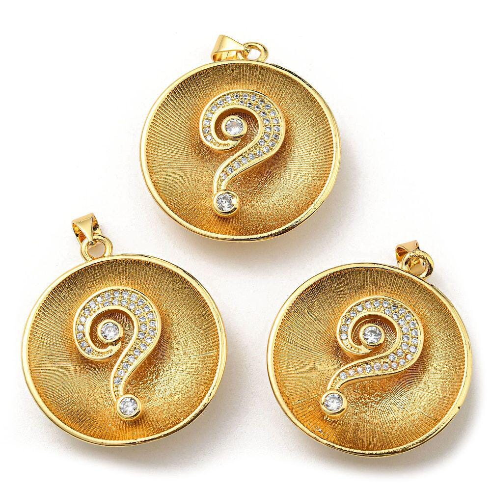 Médaille ronde avec un point d'interrogation. Ce pendentif en plaqué or est orné de strass étincelants qui illuminent le symbole, créateur un effet saisissant et mystérieux.