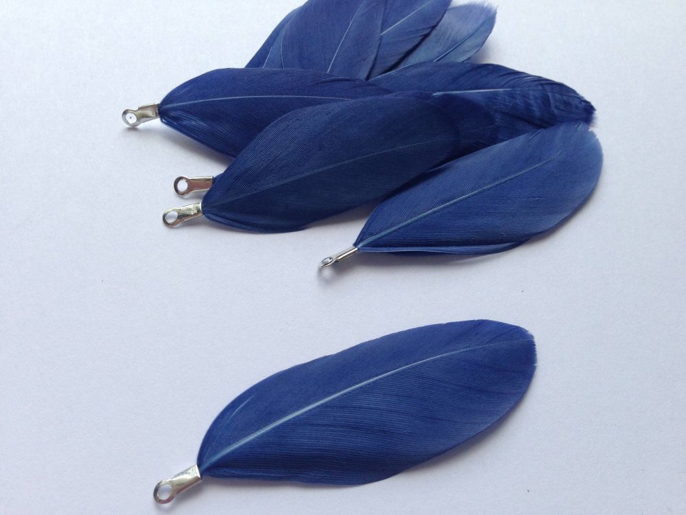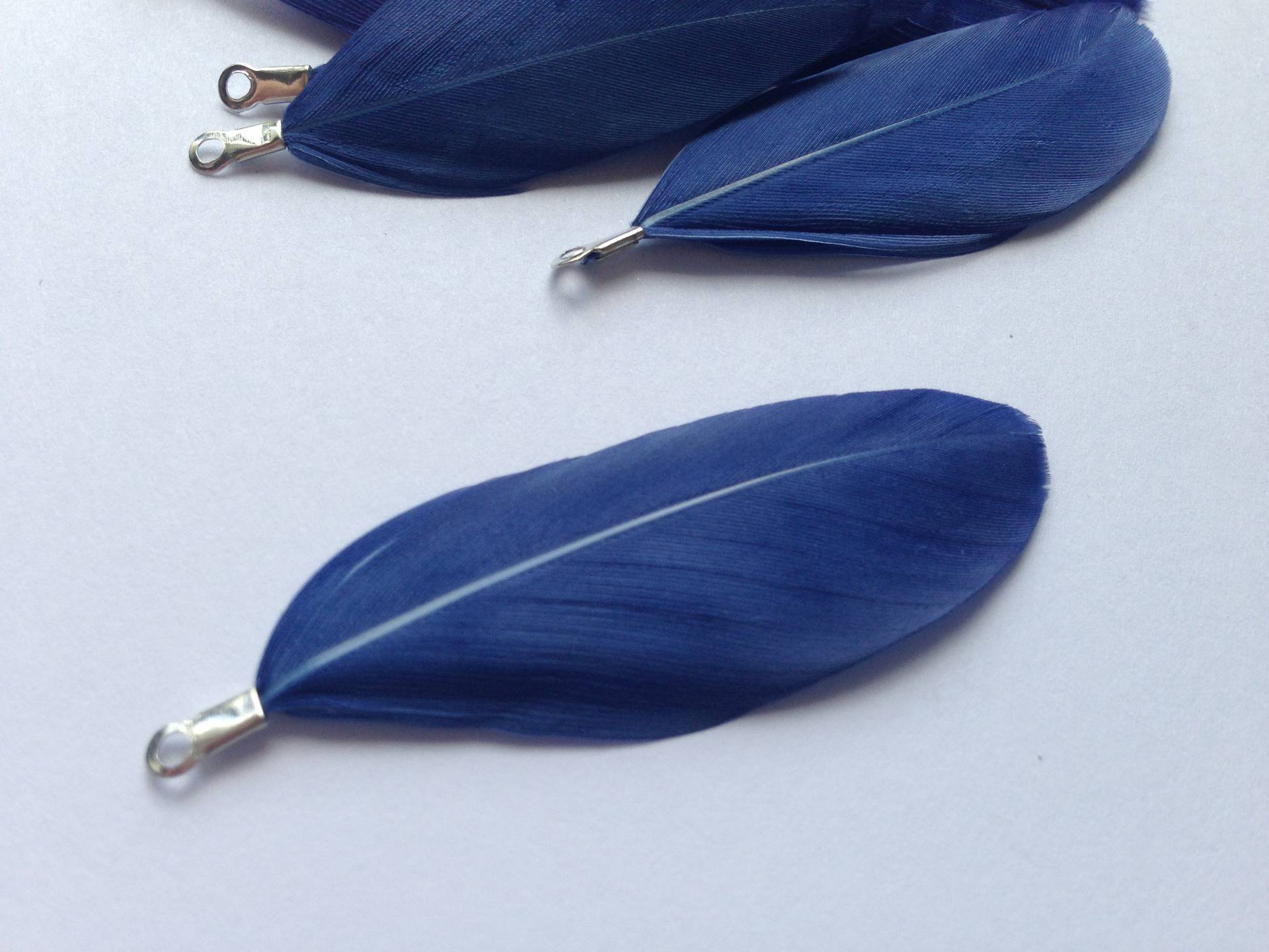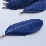 Cette plume mesure environ 4-5cm, en bleu foncé avec accroche et piquot en métal argenté, chaque plume est différente mais je peux essayer de vous en trouver des similaires pour des Boucles d'oreilles harmonieuses, n'hésitez pas à me contacter !