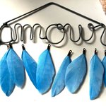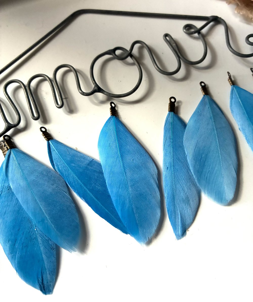Cette plume mesure environ 4-5cm, en bleu lavande avec accroche et piquot en bronze, chaque plume est différente mais je peux essayer de vous en trouver des similaires pour des Boucles d'oreilles harmonieuses, n'hésitez pas à me contacter !